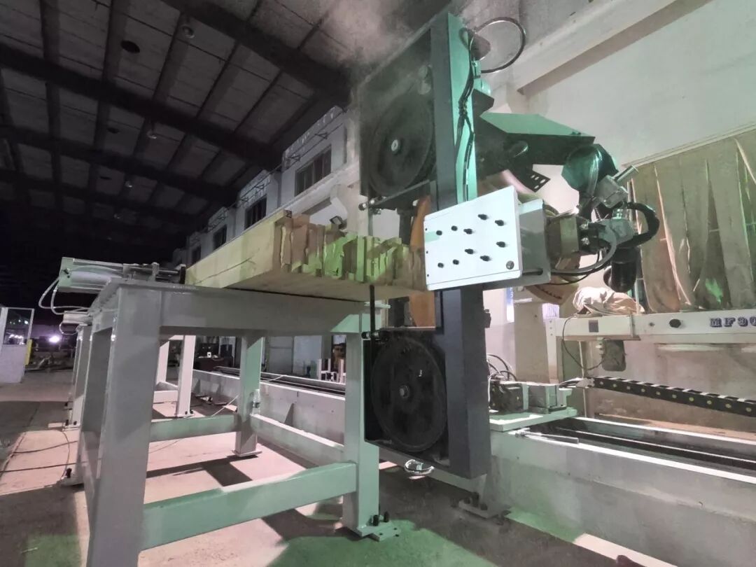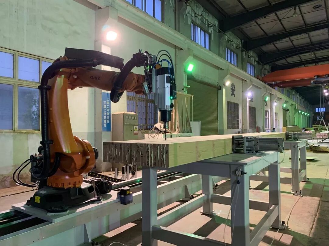 中国某著名木结构建筑生产工厂,大界的木结构机器人正在进行木材切割操作